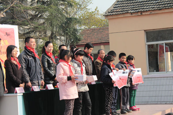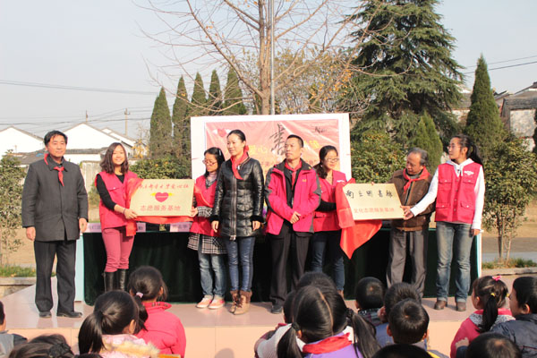 胡德宝校长的欢迎词拉开了捐赠仪式的序幕,他对南京邮电大学和南京图书馆领导的到来表示热烈欢迎,并代表全体师生对 “爱心图书角”的建立和图书捐赠表示衷心的感谢。自动化学院党委副书记高志华代表南邮爱心社承诺将长期做好支教志愿活动,用爱心为孩子们输送知识、传递希望,他鼓励孩子们要多读书、读好书,通过知识改变自己的命运。最后他对南京图书馆对本次活动的大力支持表示感谢。南京图书馆读者服务部朱志伟主任在发言中提到南邮爱心社长期坚持的义务支教活动和自发捐书举动令他们十分感动,南图得知有该项活动后立即决定将“传递知识,书送希望”活动纳入南图“爱心无界,知识无边”的系列活动中,将围绕“五个一”系列活动展开,分别是向小朋友捐赠一套图书,为小朋友免费办理一张少儿借阅证,请学生代表参观一次南京图书馆,给学生代表进行一次电脑培训,请学生代表观看一部电影。随后南邮和南图的领导为孩子们赠送了图书和南图少儿借阅证。最后由张敏书记和朱志伟主任分别进行了“南京邮电大学爱心社志愿服务基地”和“南京图书馆文化志愿服务基地”的揭牌仪式。整个活动在少先队员代表充满感激的发言中圆满结束。