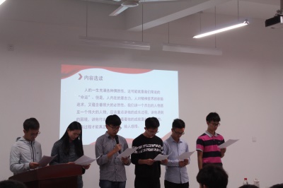 活动主要分为小组讨论、小组展示以及小组互评三个部分,而展示部分则由背景介绍和选文朗读两环节构成。各小组精神饱满,准备充分。其中第二小组的选文为《国际歌》,他们真挚而深情的朗读表现出了“巴黎公社”运动中革命无产阶级崇高的共产主义理想和英勇不屈的革命气概。接下来的第三小组则向大家分享了《习近平的七年知青岁月》,用真实的历史细节讲述了习近平总书记当年“苦其心志、劳其筋骨、饿其体肤、空乏其身”的历练故事,再现了习近平总书记知青时期的艰苦生活和成长历程,发人深省。互评环节,大家畅所欲言,言辞客观而不失幽默。