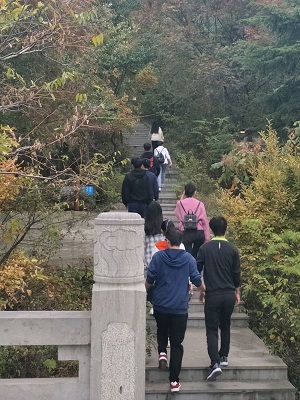 本次活动,九班同学搭乘公交车一同出行。进入栖霞山风景名胜区后,首先,来到的是栖霞禅寺,在这里,很多人焚香叩拜,同学们也在此虔诚的许下了自己的心愿,在禅寺里,同学们聆听了寺里僧侣讲解的佛家文化。接下来,听取了大多同学的意向,班委组织大家进行了登山活动。栖霞山海拔约286米,同学们选择了最近的虎山开始登山,登山栈道每隔200米会设置长椅供游人休息,在经历了两次短暂小休息之后,有些同学因为感到体力不支想要中途放弃,但经过班委鼓励,同学们全部登上了虎山峰顶。在此过程中,同学们登上读枫亭
