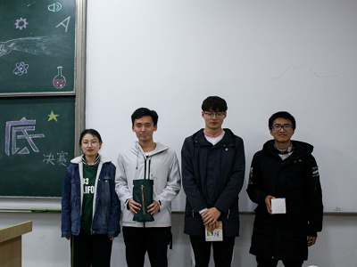第二轮筛选出了得分前四的选手进入抢答环节。此时赛况达到了最为焦灼的状态。选手们紧紧握住抢答器,目不转睛的盯着显示屏,竖起耳朵等待着主持人的“答”声令下。每当“嘀”响起,整个教室的空气宛如凝固一般,却又在选手准确地回答之后爆发出雷鸣般的掌声……除了常规问答题外,本轮还加入了音频题与视频题,使得比赛趣味性十足。第二轮比赛的结果是赵金波同学与胡峻皓同学达成平局,经由加时赛最终赵金波同学摘得桂冠,胡峻皓同学荣获亚军,刘成同学夺得季军。在硝烟弥散之前,还有精彩的观众抢答游戏。观众们踊跃参与,答对的观众还收获了许多精美小礼品。