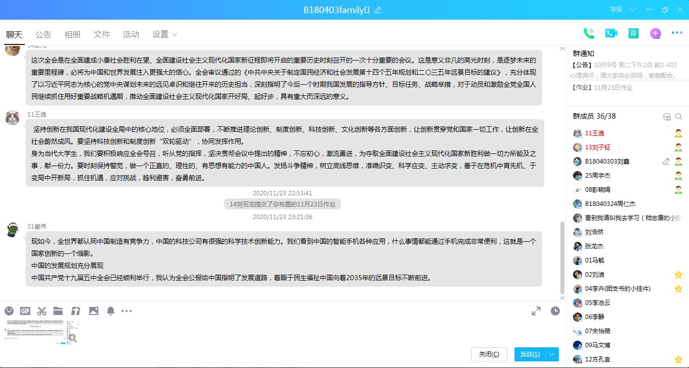三、B180405、B180406团支部以支部和宿舍为抓手,组织支部成员开展“学习十九届五中全会精神”支部活动。活动由团支部书记协同其他班委共同开展。首先,团支部书记对十九届五中全会内容做了简单的梳理和介绍,并阐述自己对于全会精神的理解,呼吁支部成员积极学习十九届五中全会精神。随后,以班长、学习委员为代表的各个班委对学习精神发表自己的看法,号召全体成员积极响应全会精神,把思想和行动统一到以习近平同志为核心的党中央决策部署上来,为实现中华民族伟大复兴的中国梦贡献智慧和力量。同时,团支部充分发挥入党积极分子、预备党员在班级中的先锋模范作用,以寝室为单位,带领全寝成员开展对全会精神的深入学习,响应党的号召,时刻紧密团结在以习近平同志为核心的党中央周围,同心同德,顽强奋斗,为实现社会主义现代化建设而努力。