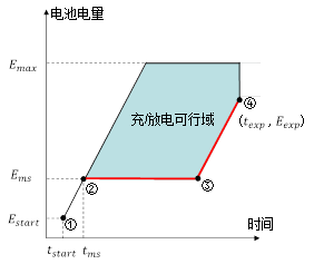 关键技术: EV的备用能力与其调度弹性密切相关,如下图所示,充/放电可行域越宽,从起始状态点运行至目标状态点的可行调度路径的功率、电量差异就会越大,体现为调度弹性增大。观察下图,影响该区域内EV充/放电的路径的主要参量为最大充/放电功率、电池容量、保底电量、期望电量、用户出行时间、当前充/放电功率、当前SOC状态,以及计及电池寿命的放电深度和放电次数。对上述参数加以整理后,可形成决定EV备用能力的2个关键边界约束,即功率边界和电量边界。 从充/放电可行域易知EV单体的上、下备用能力可按式(1)、式(2)计算: