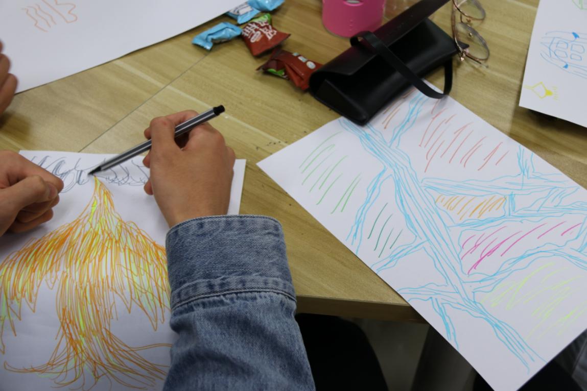 活动最后一个环节——我的自画像,大家拿起彩笔,在画纸上画出任何可以表达自己的东西,通过交流探讨,同学们直观了解到无论是抽象、形象,无论是人物、植物,都是内心世界的真实表达,都能从不同的侧面反映多样的心理状态。