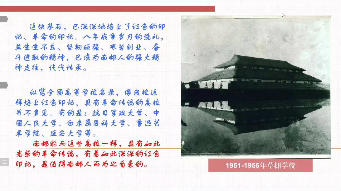 颜老师以“四月始源”开篇,讲述了我校校庆日、校庆周、校庆月的由来,而后就“红色印记史久源悠”为大家介绍了我校的办学历程和突出成绩。我校在全国各所大学中因为有着红色革命印记显得格外特别,新时代的南邮师生们更是秉持着“厚德弘毅、求实笃行”的原则,展现着南邮风采。