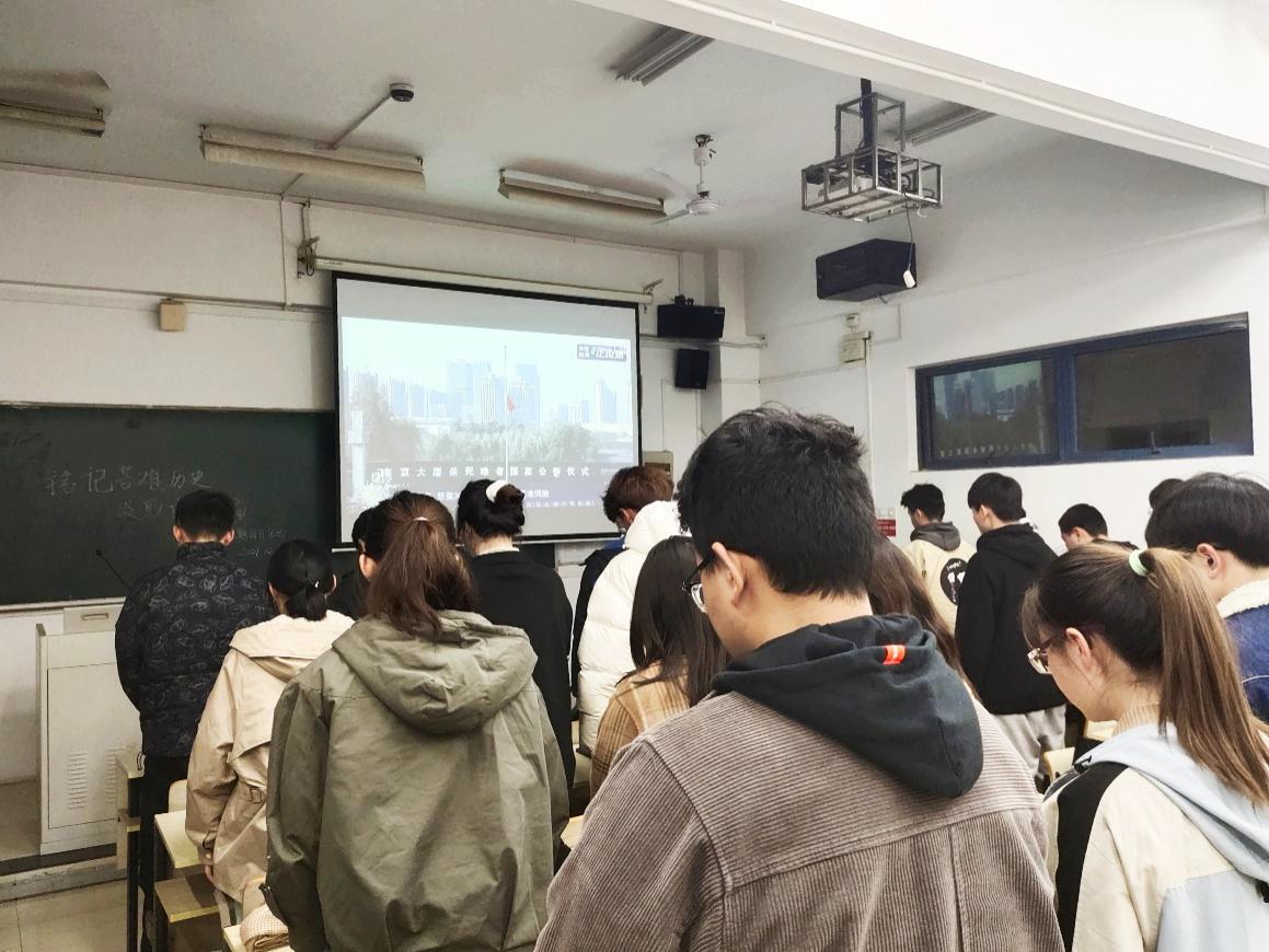 本次活动主要分为讲解南京大屠杀历史背景、揭露日本侵略者的罪恶行径、思考国家公祭日的设立意义、告慰逝者以及祈愿和平五个部分。主持人介绍了国家公祭日的设立背景,并通过图片及文字描述的形式带领大家共同回顾八十四年前的沉痛历史,通过亲历者夏淑琴老人的话语以及珍贵的历史影像揭开日本侵略者旷世未闻的兽行暴虐。在观看影像资料过程中,同学们神情凝重,专注至极。一贞贞黑白画面诉说着惨痛的事实,一句句沉重的台词背后隐藏着无尽的哀思。