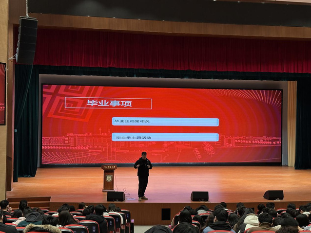 教务管理科科长苏星星为同学们进行学籍政策方面的解读,讲述临近毕业的几个月学籍相关方面的问题,包括毕业资格审核,大四重修课程,自主化学分是否达标以及能否满足毕业要求等。最后,苏星星科长强调诚信考试,走好本科阶段的最后一步,对自己负责,重视毕业设计,充分利用时间,希望大家都能顺利毕业