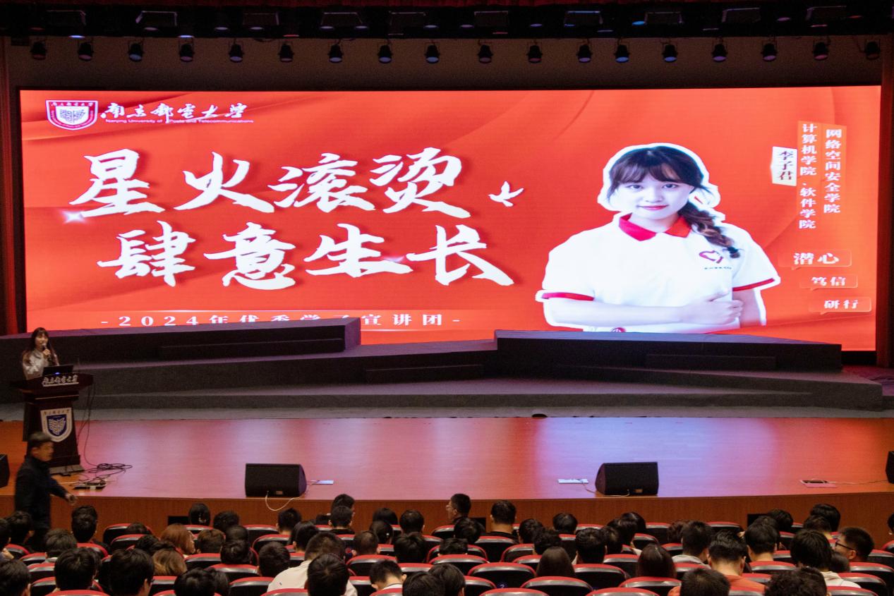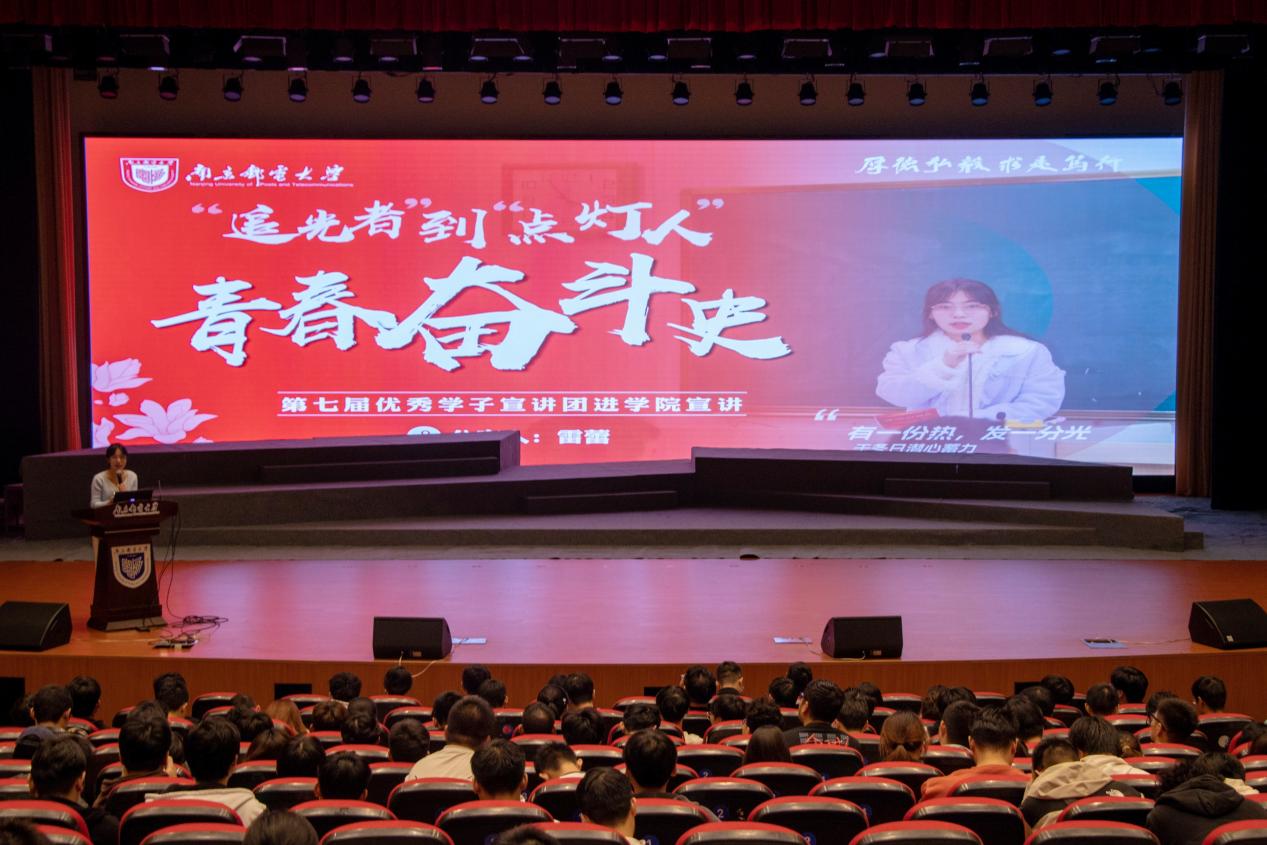 为持续推进“学在南邮”优良学风建设工作,确保学风建设工作提质增效。充分发挥各类先进典型在学生成长中的示范引领作用,打造“用身边人讲身边事,用身边事影响身边人”的朋辈教育理念,传递“向榜样学习、与榜样同行”的精神内核。10月31日晚,校第七届优秀学子宣讲团走进英国威廉希尔公司官网,500余名师生于青春剧场内共上一堂信仰公开课、梦想公开课、思政公开课。学院党委副书记、副院长孙委委,辅导员桑学峰、齐沁儿出席。活动由齐沁儿老师主持。